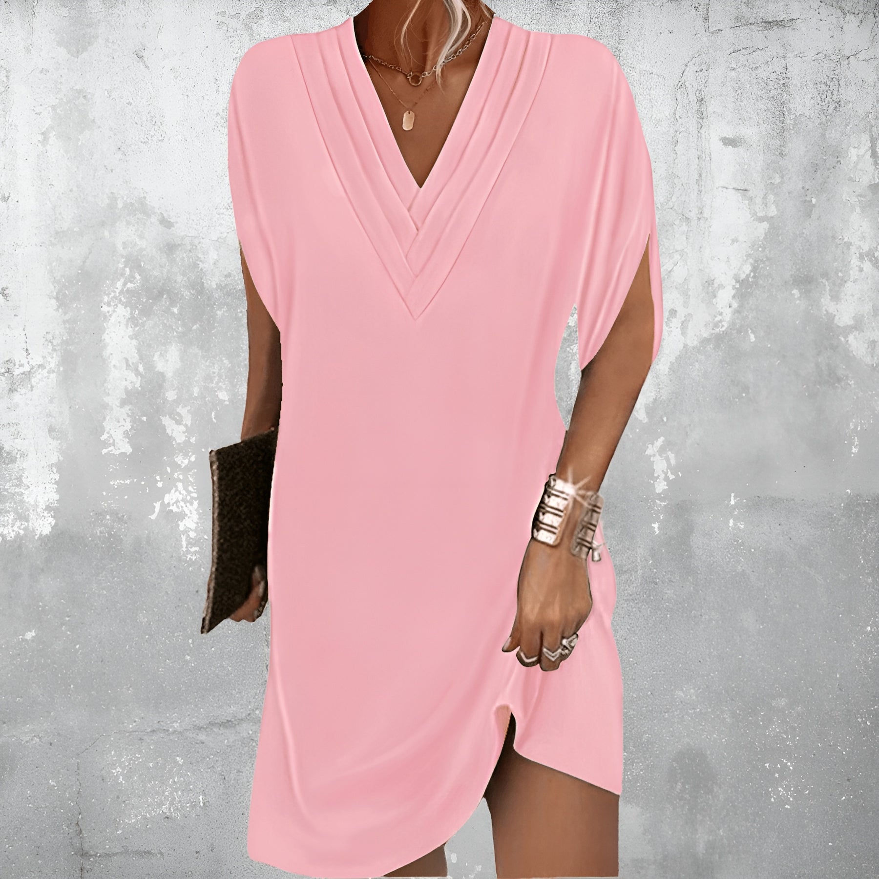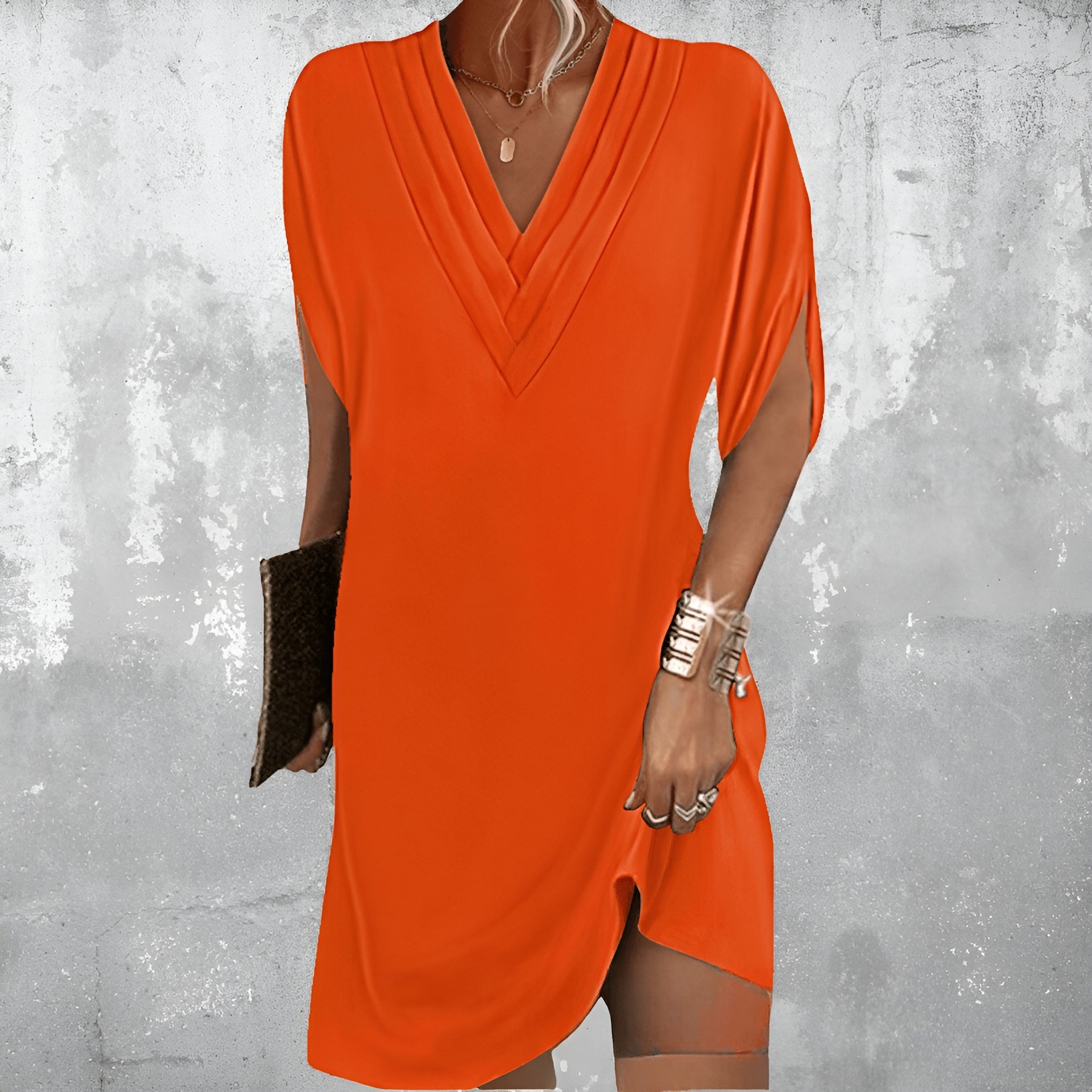 Lo scollo a V valorizza la figura mentre la lunghezza midi offre una copertura elegante e sicura.